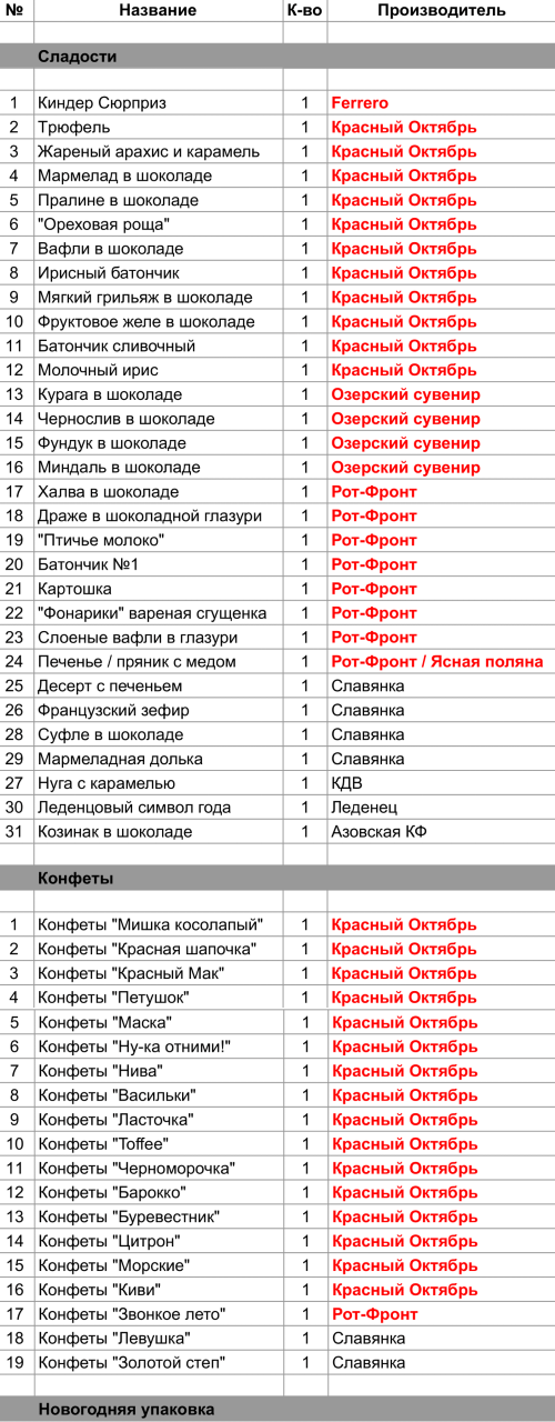 Трюфель (1 шт), Жареный арахис и карамель (1 шт), Мармелад в шоколаде (1 шт), Пралине в шоколаде (1 шт), "Ореховая роща" (1 шт), Вафли в шоколаде (1 шт), Ирисный батончик (1 шт), Мягкий грильяж в шоколаде (1 шт), Фруктовое желе в шоколаде (1 шт), Батончик сливочный (1 шт), Молочный ирис  (1 шт), Конфеты "Мишка косолапый" (1 шт), Конфеты "Красная шапочка" (1 шт), Конфеты "Красный Мак" (1 шт), Конфеты "Петушок" (1 шт), Конфеты "Маска" (1 шт), Конфеты "Ну-ка отними!" (1 шт), Конфеты "Нива" (1 шт), Конфеты "Васильки" (1 шт), Конфеты "Ласточка" (1 шт), Конфеты "Toffee" (1 шт), Конфеты "Черноморочка" (1 шт), Конфеты "Барокко" (1 шт), Конфеты "Буревестник" (1 шт), Конфеты "Цитрон" (1 шт), Конфеты "Морские" (1 шт), Конфеты "Киви" (1 шт)